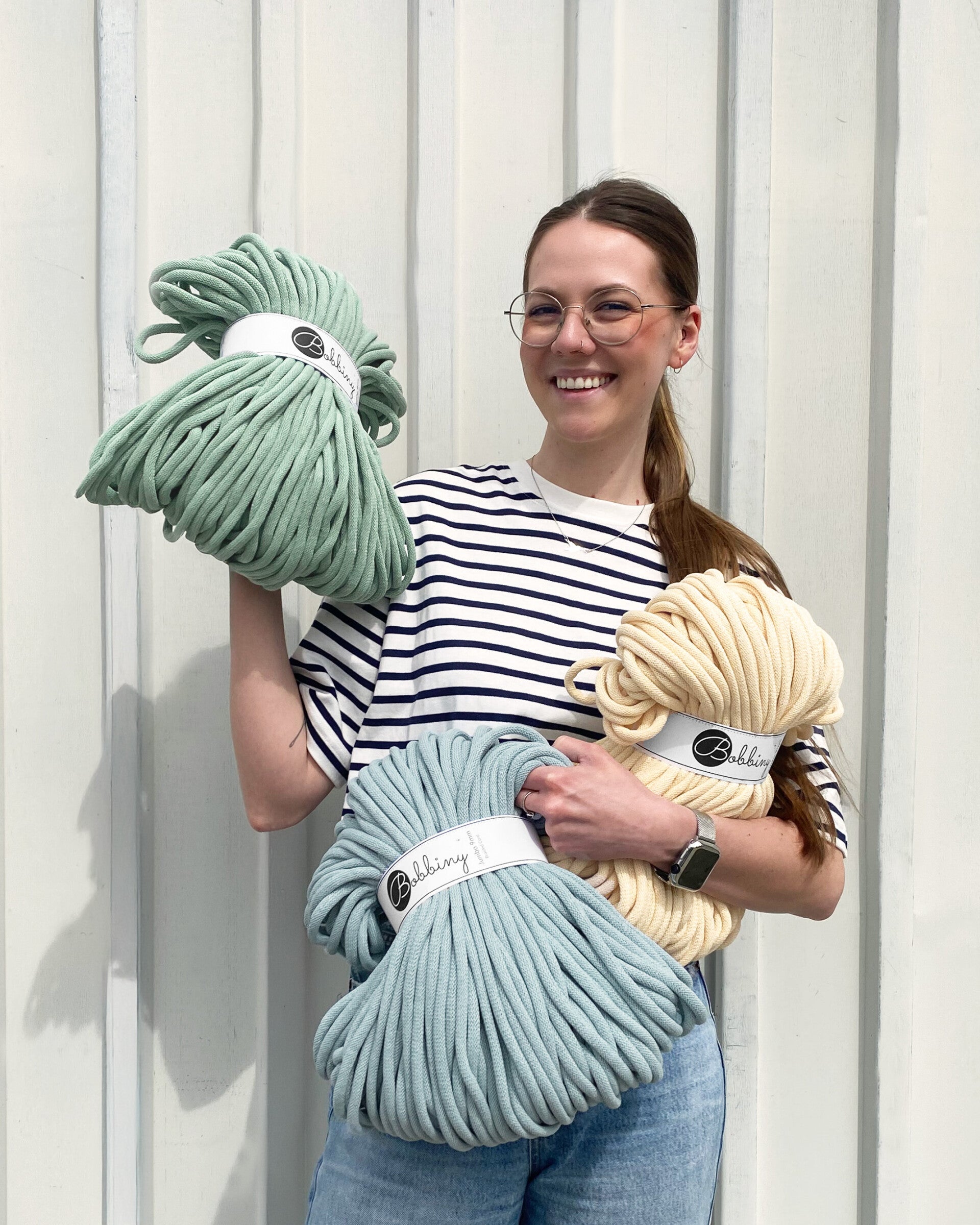 Vi tilbyr Bobbiny resirkulert bomullsgarn i to populære tykkelser, perfekt for både små detaljer og større, robuste prosjekter. Uansett om du hekler, strikker eller lager makramé, har vi garnet for deg.