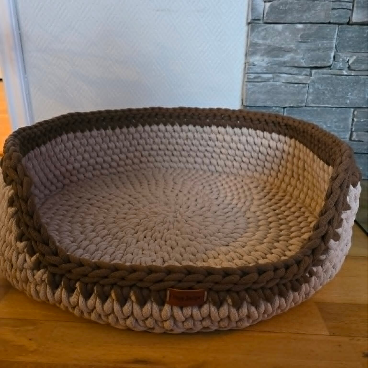 Hundesengen hekles i Knit stitch, som gir et kraftig, rustikt uttrykk og en fast form, perfekt for hundesenger som skal tåle bruk.